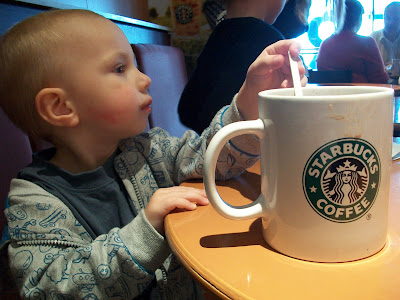 We often have a family trip to Borders and we spend hours there, the atmosphere is lovely and there is so much to see and do we nearly always have to venture upstairs for a little sit down and refresh and a browse of our books. Simon does like his caffiene and I have a big hot choclate (with cream) that I can share with the children. The size of the mug didn't stop Nathaniel from sharing too;